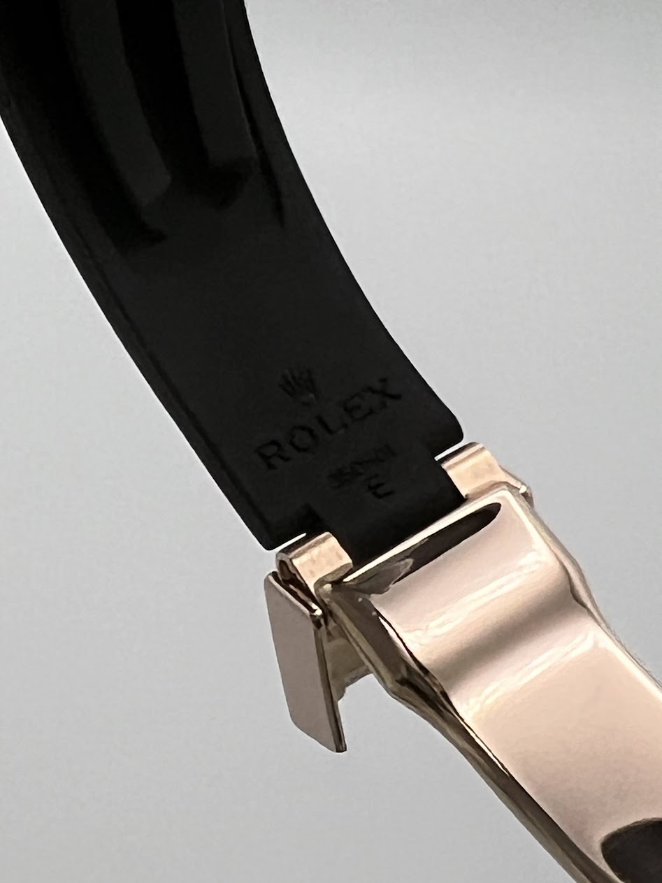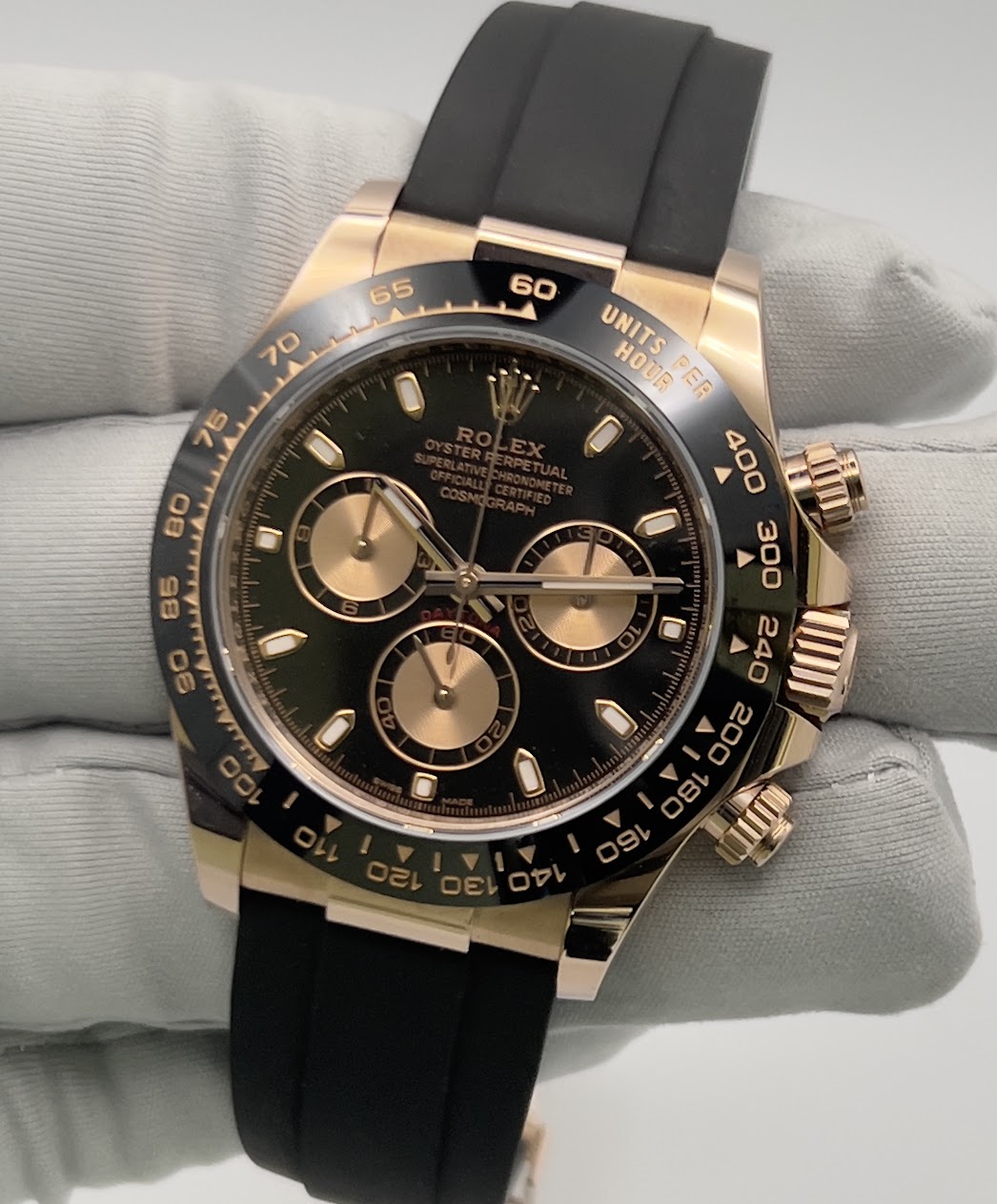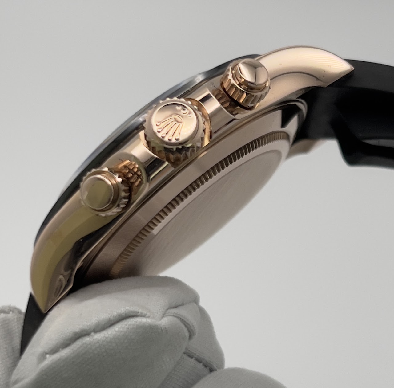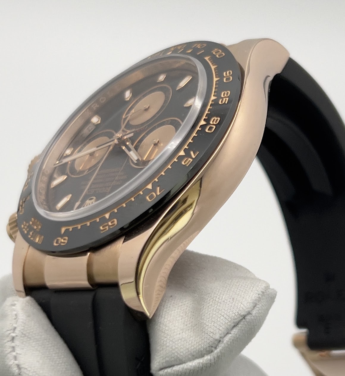 Includes only the watch and warranty card (no box or tags). A rare opportunity to own a modern Everose gold Daytona with the desirable black dial and gold registers.