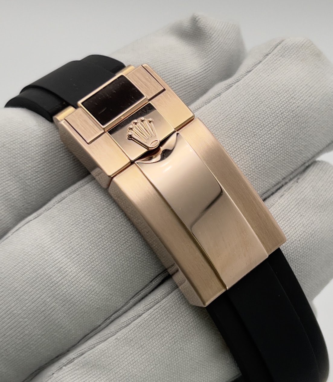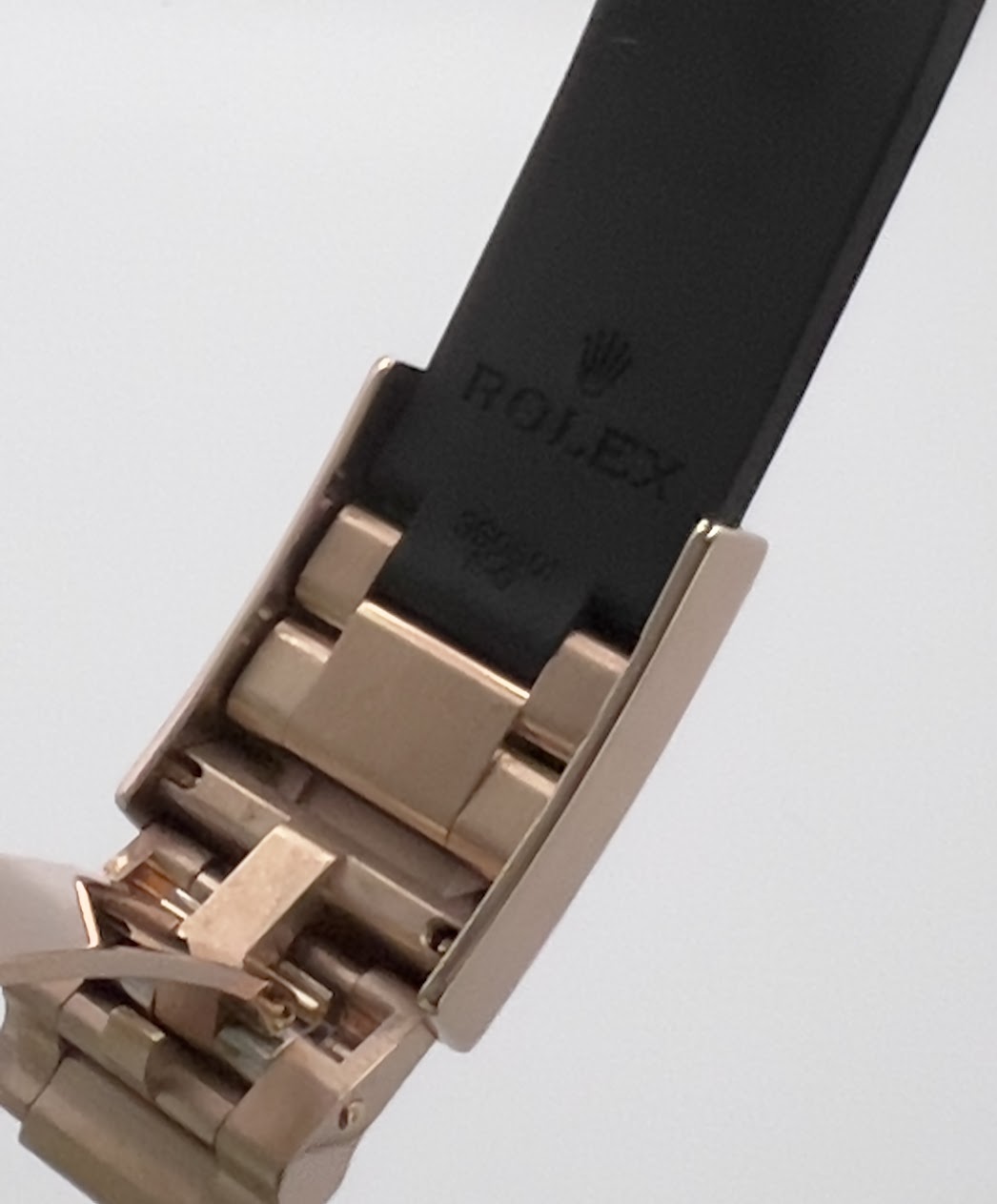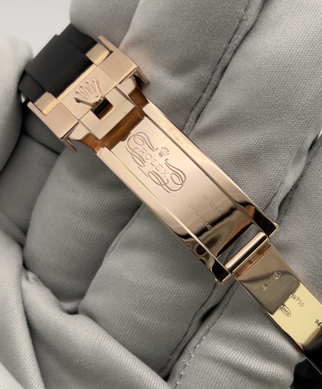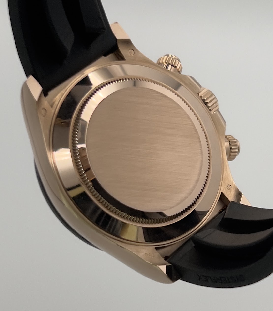 Includes only the watch and warranty card (no box or tags). A rare opportunity to own a modern Everose gold Daytona with the desirable black dial and gold registers.